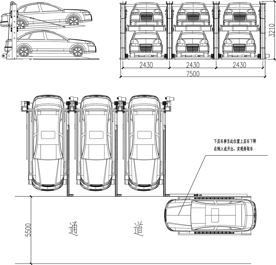 上層架移出,底層載車板在框架內部停留,上層載車板下降到地面后車輛存取車。下層停車,下層載車板橫移到位后,車輛直駛入庫;